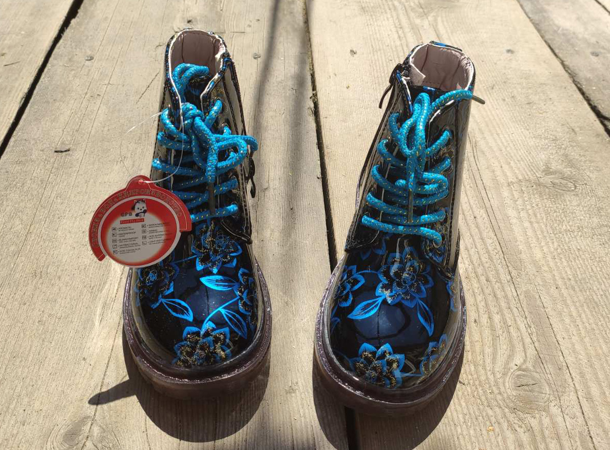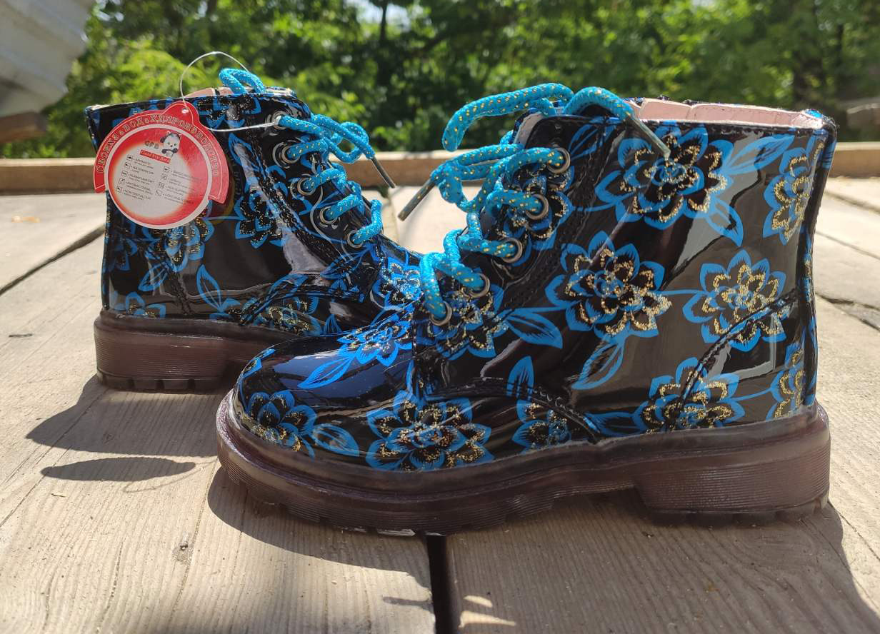 Красивая модель в темном цвете с синими цветками з позолотой. На шнурках, сбоку есть замочек для быстрого обувания. Верх - лакированный заменитель кожы. Удобные и практичные.